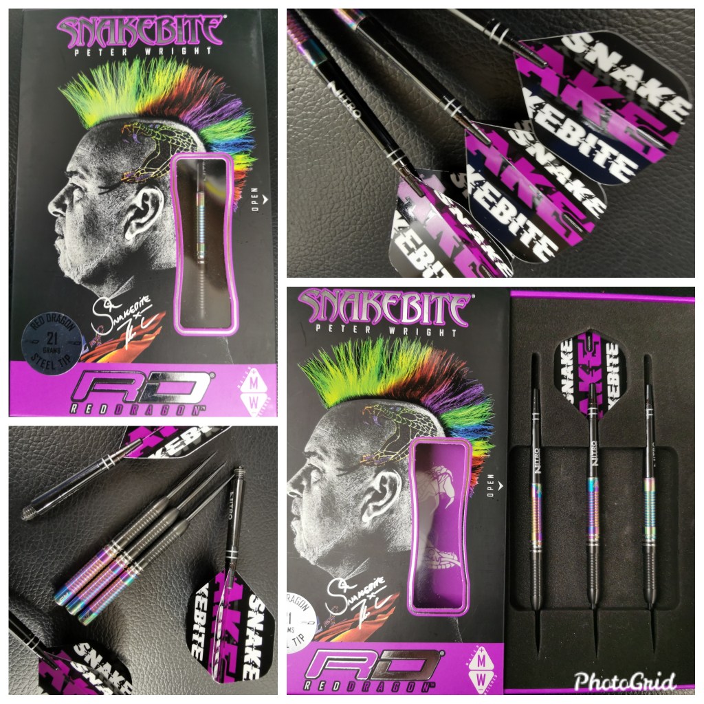 As with most Red Dragon darts, these days, the pack comes with one set of (Peter Wright WC) barrels (21g) together with a set of (black) Nitro-Tech stems and Snakebite coordinated (Purple, Black & White) set of Hardcore flights. The set up can be easily replicated via the Red Dragon store.