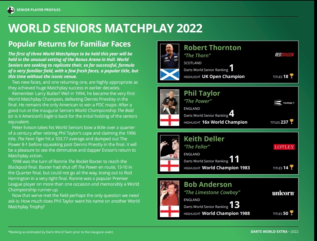 The above originally appeared as three previews in our (Free) supplemental publication: Darts World Extra