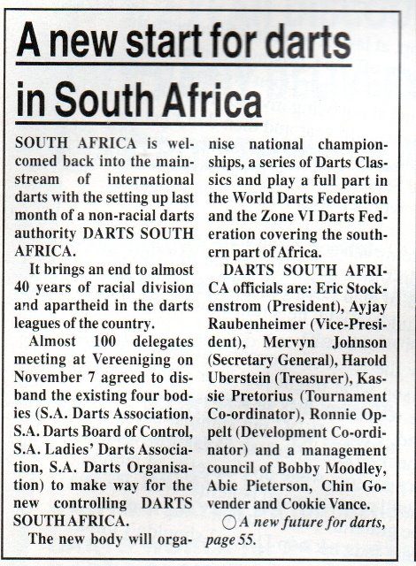 Devon Peterson may be the Icon of African darts today, but Darts World was recording the re-entry of South Africa into the mainstream of International darts back in 1992. The story below marked the official, end of segregated darts in that country and noted the forming of a new body to take the game forward.
