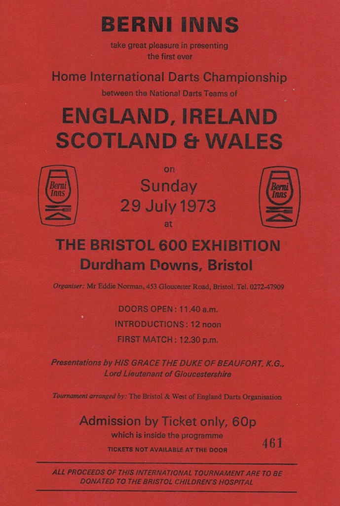 Money was the primary sticking point but the idea – the dream – was never shelved and Eddie’s resolve never faltered. Then, in mid-1971, Eddie put a plan to Bristol-based Berni Inns. He told them that he would like to organise a Home International Darts Championship in Bristol between England, Scotland, Ireland, and Wales and then asked if they would sponsor the event.