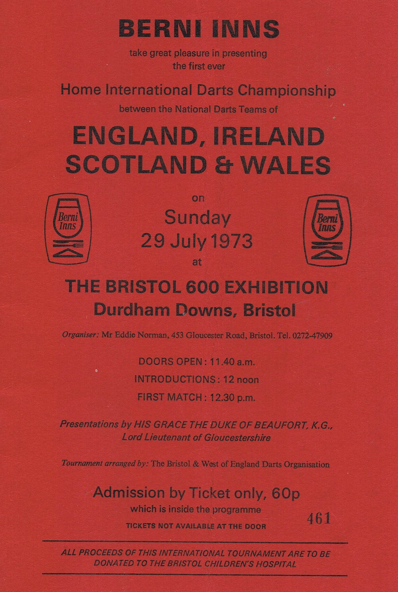 With his dream on the edge of fulfilment, Eddie started planning the first home international in earnest in mid-1972. The event would be in a giant circus-style marquee on Bristol Durdham Downs and Berni Inns covered every aspect of the sponsorship. Eddie asked His Grace the Duke of Beaufort, whose country seat was twelve miles away at Badminton House, and the Duke accepted.