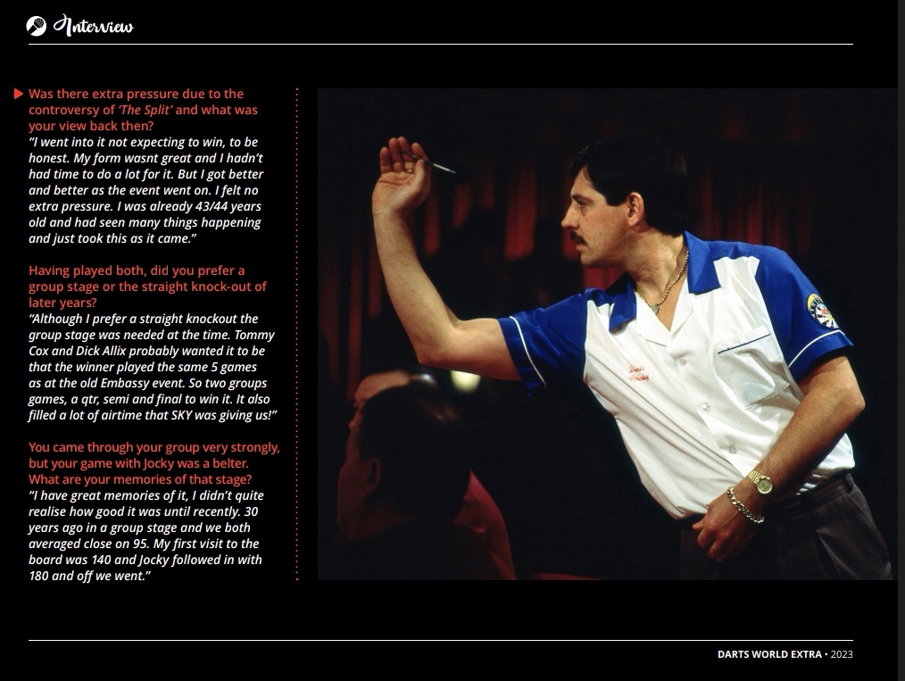 “Although I prefer a straight knockout the group stage was needed at the time. Tommy Cox and Dick Allix probably wanted it to be that the winner played the same 5 games as at the old Embassy event. So two groups games, a qtr, semi and final to win it. It also filled a lot of airtime that SKY was giving us!”