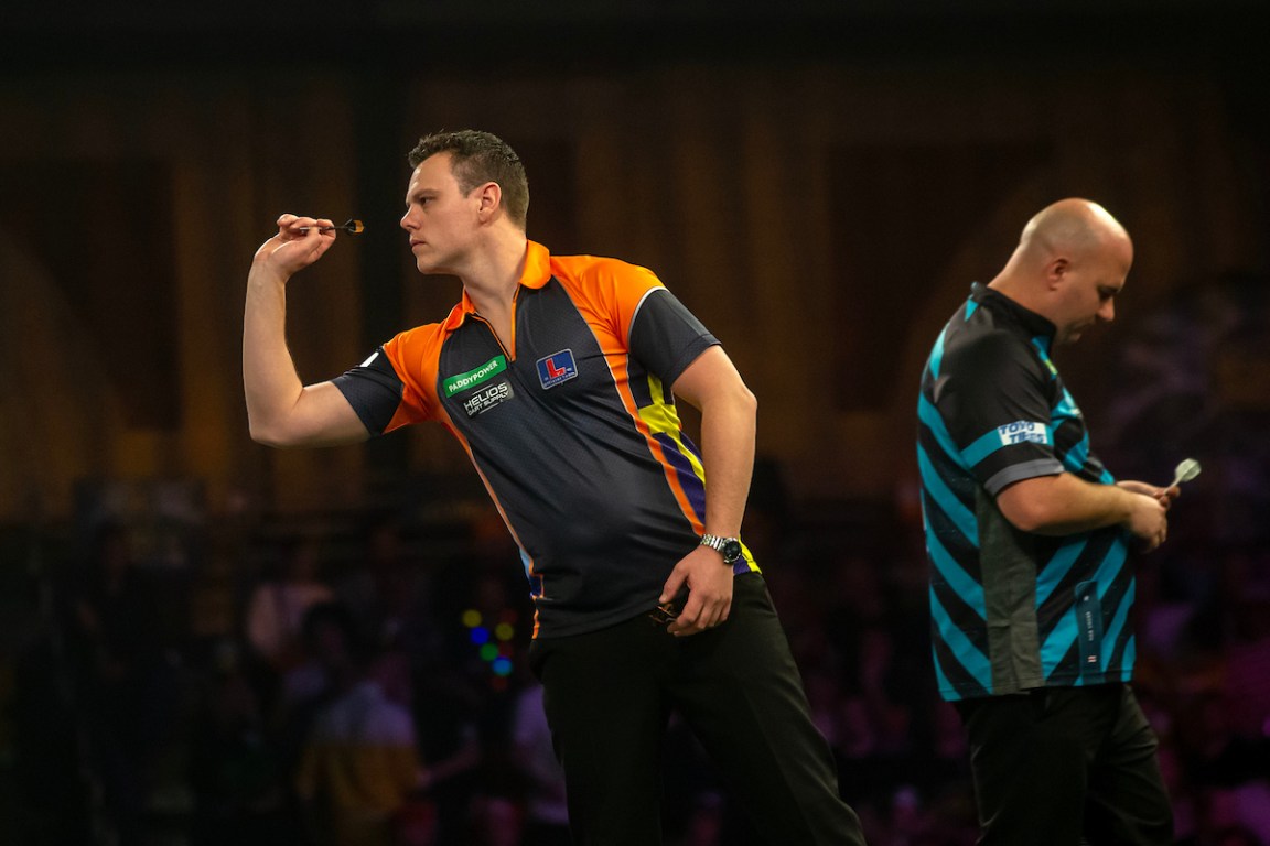 Meanwhile in Kalkar, Germany; Haupai Puha, Jules van Dongen, Radek Szaganski, Chris Landman, Patrick Geeraets, Jitse van der Wal, Paul Krohne, Benjamin Reus, Mario Vandenbogaerde, Lukas Wenig, Thibault Tricole, Michele Turetta and Tim Wolters won their PDC Tour Card alongside De Graaf.