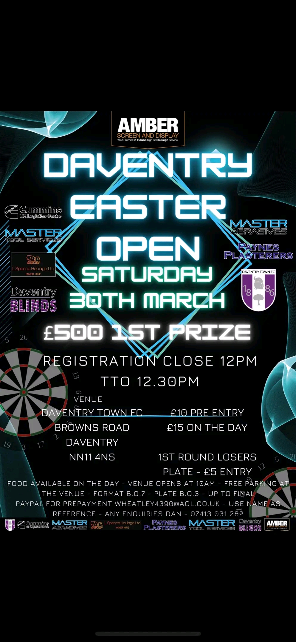 If your looking for a Darts Open this weekend and find yourself near Northamptonshire then Daventry Town Football Club could be the place for you. £500 top prize, for a £10 entry fee, os always a winner :